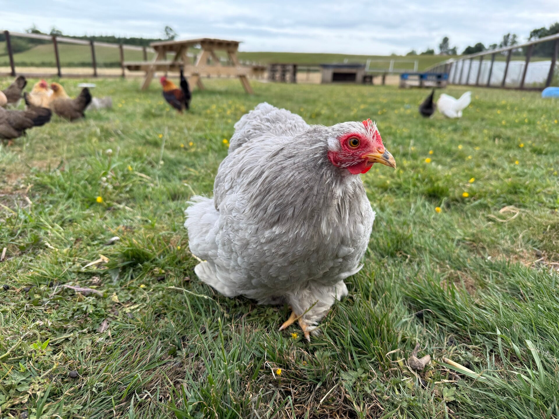 Pekins are known for their very round and fluffy shape. They feathered feet and take a wide stance.